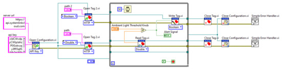 | 13 | The top part of the VI, containing the Read Tag.vi, fetches the switch status from the cloud to LabVIEW through the Boolean global variable (Figure 8). |