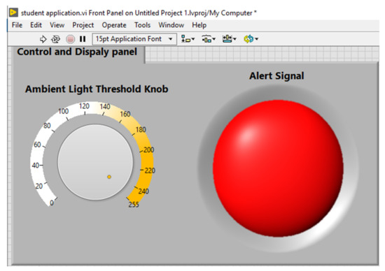The light alert LED is used to show an alert when a specific threshold is exceeded for a particular sensor. The alert signal can be used to switch an actuator connected to the myRIO device over the Internet. This alert is generated from the remote student’s LabVIEW application.