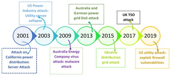 In this era of rapid development of modern civilization, the electrical power grid is considered as one of the most important and critical infrastructures for any country. The evolution of smart grid and the introduction of Information and Communication Technologies (ICT) have made the power grid vulnerable to cyber-attacks and other security threats. The National Institute of Standards and Technology (NIST) reports that there have been significant increases in the number of cyber-attacks on electrical power grids over the last decade []. One of the most notable cyber-attacks on power grid is the strike on the Ukrainian power grid in December 2015, where the hacker accessed the Supervisory Control and Data Acquisition (SCADA) information, disrupted the normal operation, and caused the disconnection of 30 substations in total, affecting 225,000 customers for approximately 3 h []. The major attacks on the electric power grid [] in this millennium has been depicted in Figure 1. In this context, NIST has outlined and set the three primary cyber security requirements for the smart grid. These three requirements are: (1) availability, (2) integrity, and (3) confidentiality, respectively []. They are further termed as the “essential criteria for cyber security”.