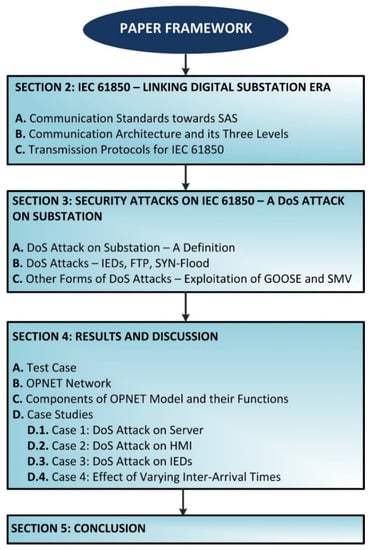 The rest of this paper is organized as follows. Section 2 talks about the linking digital substation era in IEC 61850. Section 3 discusses the possible security attacks in IEC 61850, with a focus on DoS attacks (SYN-FLOOD). Section 4 illustrates the simulation and results which involve the model system and its components. Finally, Section 5 concludes this paper and suggests future research work. Figure 2 shows the complete framework of the paper.