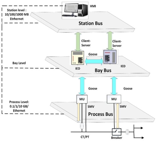 Maintenance and operation procedures are standardized. Moreover, the use of copper cables is also reduced, which further reduces the cost to implement. Ethernet-based communications which operate at high speeds are used to create a data management system which increases its efficiency and reduces operational delays. Expandability refers to the ability of the communication system to be changed or increased in size with ease as the requirements of the power system change. Since the network is built using Ethernet technology, it is easy to take into consideration any potential changes that may occur in the future. IEC 61850 aims to cover all aspects of substation automation technology by reducing the complexity and maintenance cost, specifying protocols such as TCP/IP and UDP/IP, and ensuring data interoperability among multivendor IEDs (Intelligent Electronic devices) []. Figure 3 presents a detailed architecture of IEC 61850 along with communication strategy.