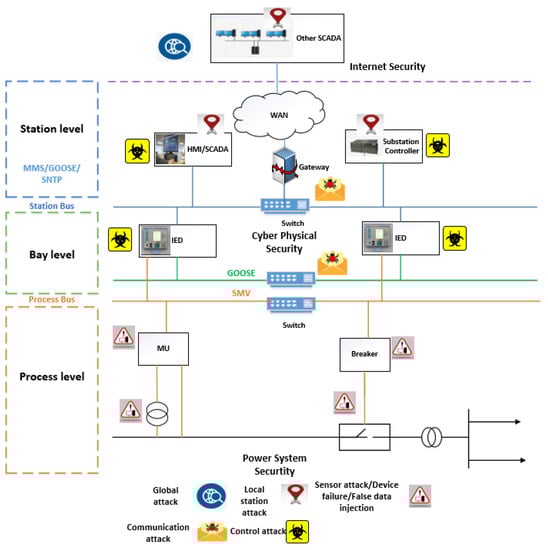 In power grids, a grid substation is an integral component of the power system. The substation serves a multitude of purposes such as: (1) stepping the voltage up or down to allow transmission and distribution, (2) managing fluctuations in voltage, (3) controlling the network for maintenance, (4) providing protection from faults, and (5) allowing the power network to be managed by utilizing circuit breakers, switches, and other devices. These all purposes are well taken by the ICT-enabled SCADA systems in the present era of smart grids, which can monitor and control the grid more efficiently and autonomously. In addition to the enhanced communication technologies, the development of IEC 61850-based smart substations has allowed for better monitoring and control of the power system by utilizing Ethernet communications and IEDs []. However, with the process of digitalization, these substations have become increasingly more complex and have been exposed to potential cyber security threats which could lead to a shattering effect on the power system. These threats are posed from numerous parties such as hackers, ex-employees, competitors, and even maintenance personnel. Being the core part of the power grid, the security and the reliability of the power grid needs to be ensured first at the substation level []. Therefore, it is important to develop appropriate solutions to ensure the safety of the grid and protect it from threats from all the possible sources, which is the focus and motivation of this work.