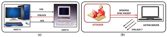 SYN-FLOOD attack: (a) three-way successful handshake and (b) attack mechanism.