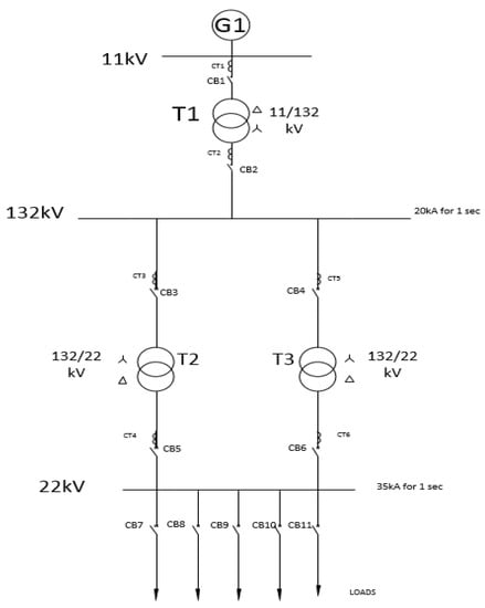 The test case involves simulating a section of the power grid in a substation. This can also be seen in Figure 6. Transformer 1 (T1) between bus bars B1 and B2 can be taken as the substation that will be simulated. CB1 and CB2 are connected to IEDs in the bay level which control, monitor, and protect the power system. Power is generated at G1 at a base level of 100 MVA and a voltage of 11 kV, as shown at B1. T1 steps up the voltage to 132 kV, as can be seen at bus bar 2 (B2). Two parallel feeders are present from the B2 to the 22 kV bus (B3) with Transformers T2 and T3 on separate lines. All the transformers within the system are protected using differential protection through the current transformers.