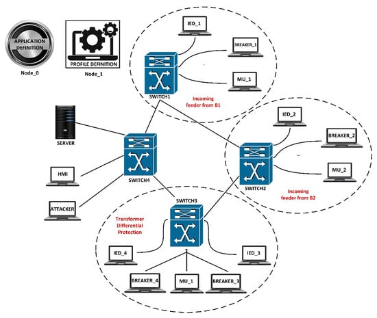 The OPNET model includes four switches. These switches are placed in a ring network topology with Switches 1 and 2. Both these switches have an IED node, Breaker Node, and Merging Unit (MU) nodes attached to them. With reference to the power system layout described in Figure 7, the functionality of these components is described as follows. IED 1 provides protection and control to the incoming feeder from bus bar (B1) into the substation. MU_1 provides measurements taken from the process level of the substation which the IED analyses and may take necessary action if required. Breaker_1 represents the circuit breaker on the incoming feeder between T1 and G1. Switch 2 is also connected to three ethernet station modules representing an IED, a breaker, and an MU. Breaker_2 represents the circuit breaker on the outgoing feeder from substation T1 to B2. Switch 3 has 5 ethernet nodes attached which include IED’s 3 and 4, breakers 3 and 4, as well as a merging unit. The purpose of these nodes is to provide differential protection of the substation transformer T1. Switch 4 is the last switch in the network. The station HMI and server are connected to this switch. The application and profile configuration nodes shown below have been used to create background traffic flows in IEC 61850-compliant digital substations.