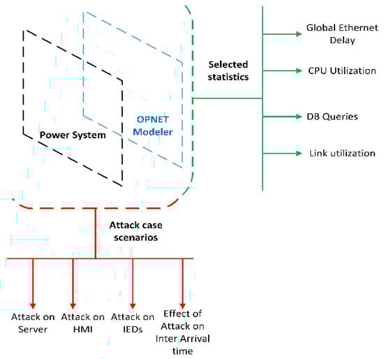 The case studies and simulations have been performed in the IEC 61850 laboratory of Curtin University. In this section, an OPNET model will be utilized to analyze the four vital statistics for further analyzing the attack cases. Table 3 provides the definition of these selected statistics. In Figure 8, the simulation and model system are illustrated where the attack cases and selected statistics are presented.