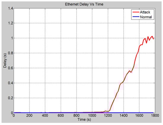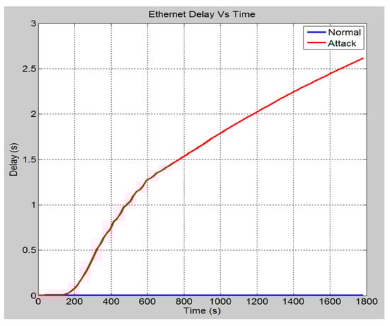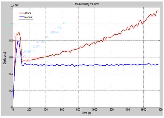 In this scenario, a DoS attack has been launched on the HMI computer. This is to prevent personnel from executing the control and monitoring functions. Figure 12 demonstrates the CPU utilization of the HMI computer under both conditions. Under normal operation, the CPU utilization remains close to 1%. However, once the attack has been launched, it has been noticed that the CPU utilization rises significantly. At approximately 15 min, the CPU utilization has been increased to over 95% and ends at 100% CPU utilization. As a result, operators have lost their access to carry out control and protection operation through the IEDs. This is because the computer has been occupied with all the false messages it has received. In the same pattern, the global Ethernet delay for the entire system is shown in Figure 13. The Ethernet delay is higher in the attack scenario. However, the difference in the delay between the two scenarios is approximately 0.7 milliseconds. The Ethernet delay in the attack scenario is within the acceptable limit. The reason for the marginal increase in the Ethernet delay can be attributed to the fact that the number of requests received by the HMI station is significantly lower than that received by the server as in the previous scenario. In other words, the other nodes are not as reliant on the HMI station as they are on the ethernet server. Hence, causing the HMI to crash does not cause the Ethernet delay to increase as significantly. In addition to that, the other IEDs are working properly and are not suffering any sort of malfunction hence the operating conditions are ideal and a low Ethernet delay is expected.