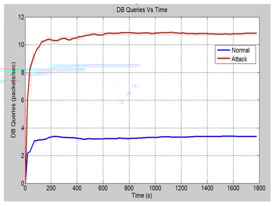 This scenario talks about the assumption where a hacker gains access to the bay level into switch 4 (See Figure 6 for power system layout). This access was made through the attacking node, which is connected to port 12 of switch 6. In such a situation, from this device, an attack is launched on the port by flooding the receiving ports with data. This is done by disguising the source IP address and setting it to an unreachable address. Figure 9 demonstrates the effect of the SYN-Flood DoS attack on the global ethernet delay in the system. It shows that in the no attack scenario, the average Ethernet delay is 0.57 milliseconds. However, once the attack is launched, the ethernet delay rises to 2.6 s at the 30 min mark and will continue to increase until the server crashes. Note that for a GOOSE message relating to the trip operation, the maximum allowable delay is 1 millisecond. Hence, the attack has effectively nullified the ability of the system to implement the required operations within the acceptable limits. Figure 10 demonstrates the number of database queries sent to the server in both scenarios. Under normal operating conditions, the server receives slightly fewer than 3.5 packets per second. In the attack scenario, the number of queries received is 11 packets per second. This shows that the number of incoming queries increased by a factor of three. Figure 11 demonstrates the average CPU utilization for both scenarios. Under the normal operating conditions, the maximum CPU usage of the server is 16.2% of its maximum capacity. Once the DOS attack is launched, the average CPU utilization increases to 100% of its maximum capacity within 1 min of the attack. The attack has occupied the server with false data and has severely limited its ability to establish connections with legitimate clients and therefore causing the DoS.