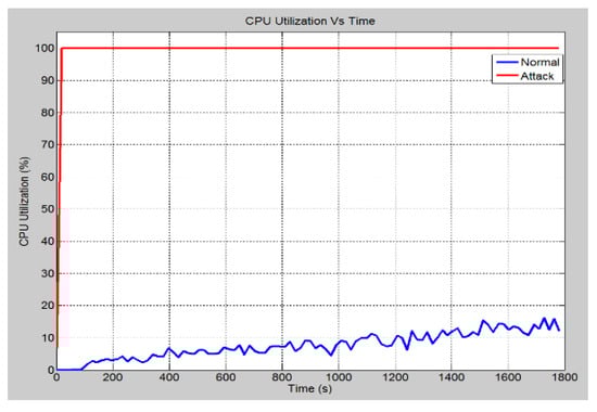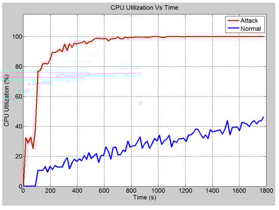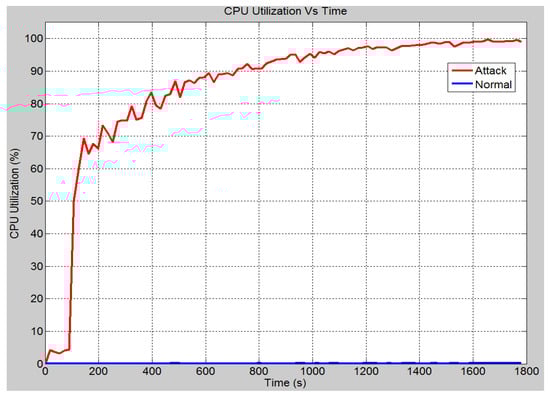 In this scenario, a DoS attack is carried out on both IEDs 3 and 4. This is also shown in the OPNET layout in Figure 7. The attackers are able to manipulate the data input into the IEDs and overburden the CPUs and consume the link bandwidth. The following results demonstrate the effect of such attack. In the no attack scenario, the global Ethernet delay is approximately 0.52 milliseconds (See Figure 14). This means that GOOSE messages are sent within an acceptable time limit. Under the attack scenario, the Ethernet delay rises to approximately 1 s. The CPU utilization under the two different scenarios is compared in Figure 15. Under normal operation, a maximum CPU usage of approximately 46% is observed while under the attack conditions, the CPU usage raises to 100% within 10 min approximately. The significant increase in the CPU utilization for the attack scenario means that the IED is unable to respond to legitimate requests and hence denial of service has been occurred.