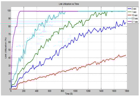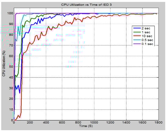 In this scenario, the rate at which the attack data has been sent to IEDs 3 and 4 is altered. This was to observe the effect on the system. Figure 16 demonstrates the effect of changing the inter arrival times of the attack data, i.e., the rate at which the data is sent. As can be seen when the inter-arrival time is set to 0.1 s, the delay is significantly greater, and it increases at a much faster rate as determined by the greater slope. As the inter-arrival time is increased, the delay becomes smaller, and it takes longer for the attack data to cause the system delay to increase. This is expected since the more data the device receives in a short period, the longer it takes to process, and hence delays are increased. In Figure 17, it can be seen that the CPU utilization rate takes longer time to reach 100% as the inter-arrival time is increased. With an inter-arrival time of 0.1 s, there is an almost instantaneous jump to full CPU utilization, while the inter-arrival time of 10 s takes longer time. The higher the inter-arrival time is, the more time it takes to reach full CPU utilization. Figure 18 demonstrates the link utilization for the different inter-arrival times. As expected with the faster inter-arrival time, the link reaches to its maximum capacity much faster. With the 0.1 s inter-arrival time, 100% link utilization is achieved within 36 s. However, with the 1 s inter arrival time, 99% link utilization is achieved in 1494 s. Additionally, it can be seen that the 10 s inter-arrival time does not reach at 100% link utilization. By conducting the simulation for a longer duration, a greater link utilization would have been achieved. However, 100% link utilization does not appear to be feasible. The reason for this is the recipient IEDs will begin to drop the pending connections due to the long waiting time between requests. Figure 19 demonstrates the effect of changing the inter-arrival time of the attack data on the throughput between IED 3 and switch 3. From the stacked bar chart, it is evident that the lower inter arrival time results in more packets per second through the link resulting in higher link utilization. An inter-arrival time of 0.1 s has the highest throughput while a 10 s inter-arrival time has the lowest link throughput.