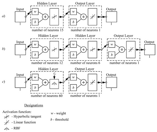 Figure 3c shows us an artificial neural network based on radial basis functions. This neural network allowed us to obtain minimum mean square deviation of the wavelet from the sample: 1.5762 × 10