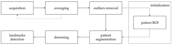 The depth range was limited to 2 m in the acquisition process to reduce the number of additional scene elements. A high noise level characterizes data collected from a single acquisition. The pre-processing is aimed at reducing the noise and automatically determining the region of interest related to the silhouette of the examined person (Figure 2). At the stage of acquisition, noise reduction is carried out by averaging the coordinates of successively obtained matrices [29]. Unfortunately, such an approach causes the time resolution to be decreased.