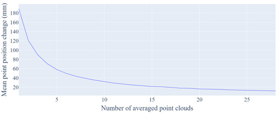 The mean point position change concerning to the number of averaged point clouds. The Euclidean distance was calculated for the corresponding points in the coordinate matrices obtained by averaging the successive N and N-1 point clouds.