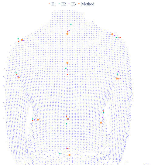 In most cases, the detection error between the presented method and the experts did not differ from the error in assessment between experts. A direct comparison of the distances of the indicated points between experts and the method showed that the compared differences were statically significantly different; however, the effect was negligible. The lack of location of the landmarks marked by experts directly on the subject’s body limited the results obtained. However, because the measurements were performed under dynamic conditions, it was impossible to determine the anatomical structure positions in variable poses. Marking markers on the skin, in this case, would also be subject to error due to changes in the location of anatomical structures under the skin.