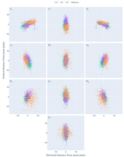 As a result of the applied outlier reduction criterion, at most 8% of the points for each landmark were removed from the first stage of the analysis (comparison of the mean and deviations). The gross errors were not related to any specific subject. They occurred in single clouds for different subjects. The cause of the errors was the temporary atypical position of the posture or upper limbs, which could have resulted in an incorrect indication of the search areas at the first stages of the algorithm.