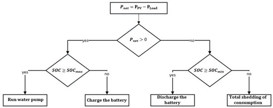 In case of power excess, the surplus power will be transferred to the battery. In fact, if the battery SOC is higher than its maximum level, the power excess will be used to power a water pump. In this way, the surplus or lost energy will be highly limited.