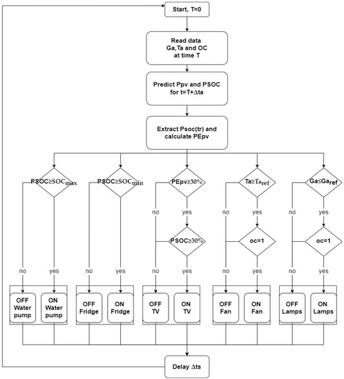 The three inputs Ta, Ga, and are measured directly in real time via their appropriate measurement tool, and the predicted data are based on their previous values only and are independent of time. The load management algorithm is presented in Figure 3.
