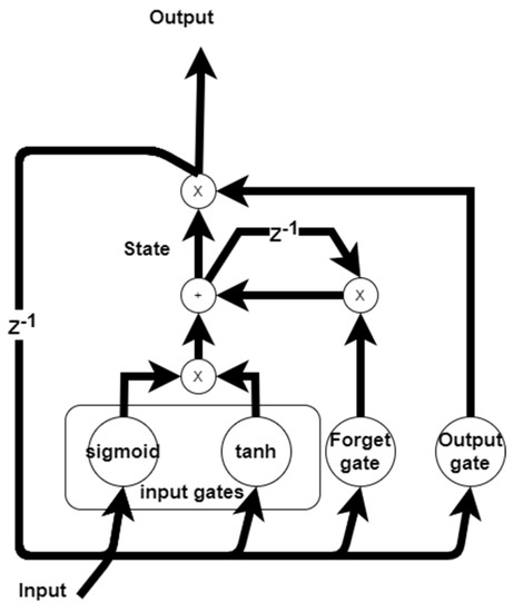 The internal structure of an LSTM network is composed of many perceptrons that are connected in a well-organized manner, as shown in Figure 4. Each perceptron can be modeled as a gate, and these gates can feed forward the information contained in them; they are the input gate, output gate, and cell gate. Another type of gates is called the forget gates, which have the ability to remove information from the next time step output. The gates are controlled via and activation functions. Another important element is the cell state, which is directly connected to the LSTM output, and the other gates are used to control the information flow to this cell.