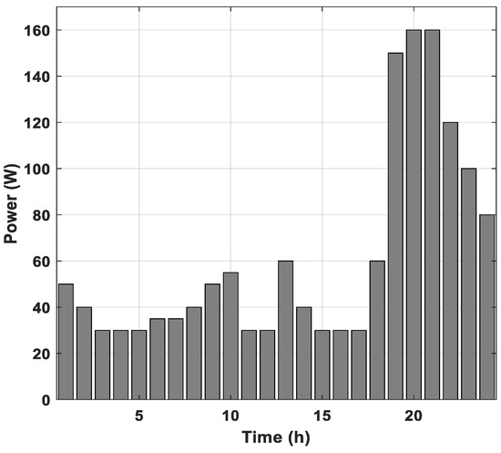 Figure 5 shows a typical load profile of a selected location (an African tropical country with a high-quality natural irradiance). It is characterized by a peak consumption during the night period. It has 160 W of peak power consumption and 1.475 kWh/day of daily energy consumption.