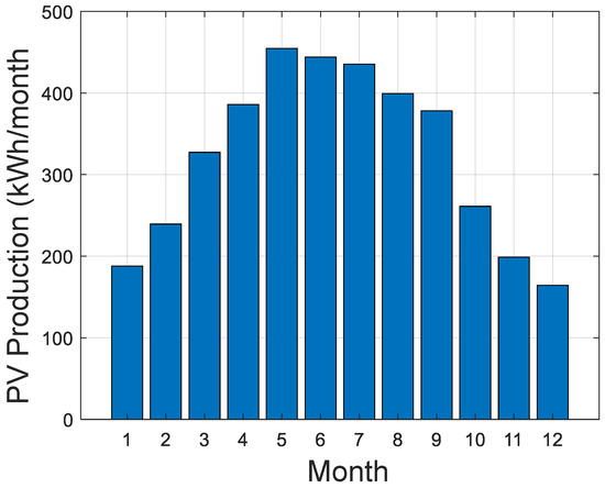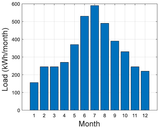 The simulation is performed over one year and uses the collected weather data of the selected location. The weather data are obtained using a Photovoltaic Geographical Information System (PVGIS). Figure 6 shows the monthly production of the PV panels, while Figure 7 shows the monthly load consumption.