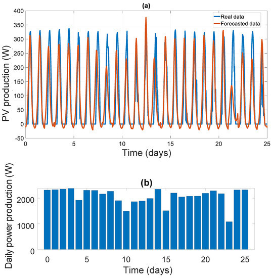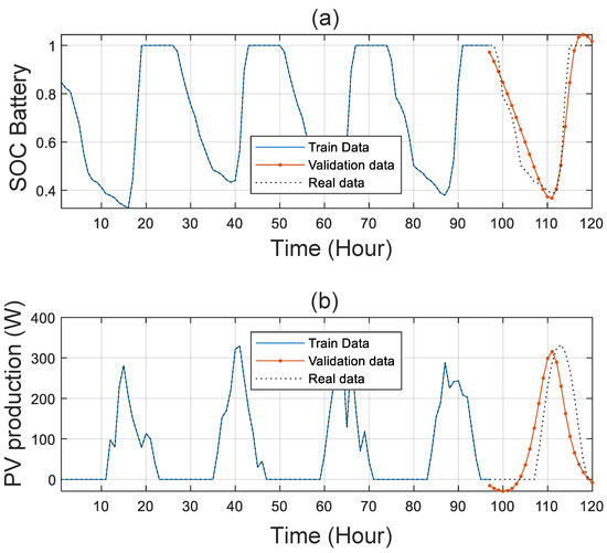 Figure 8 presents the forecasted PV power (Figure 8a) and the battery SOC (Figure 8b). We used the well-known LSTM neural network prediction; with our technique, we can predict 24 h from the data of four previous consecutive days.