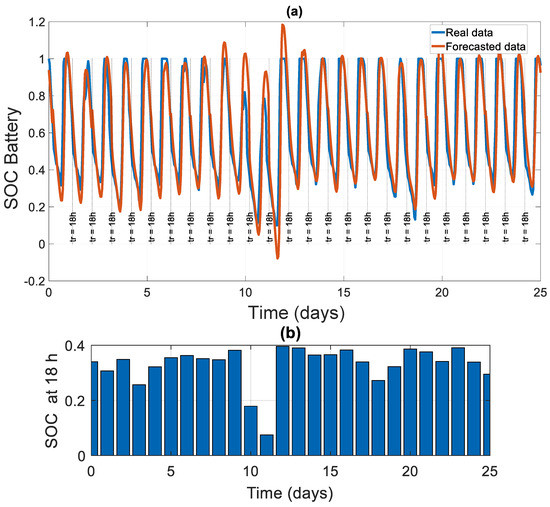 Battery SOC forecasting results over 25 days using LSTM network: (a) battery SOC real and forecasted data; (b) forecasted battery PSOC at tr = 18 h00.