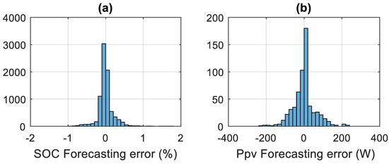Yearly forecasting error: (a) histogram of PPV power forecasting error; (b) histogram of battery SOC forecasting error.