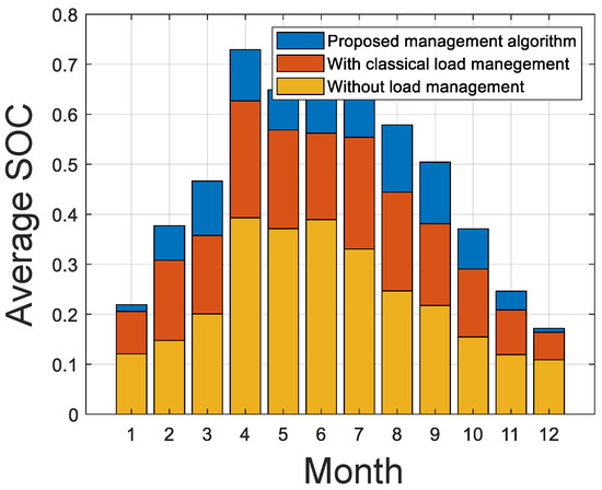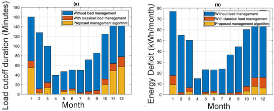 With the results, we conduct a comparative study between the system with load management and without load management. Figure 12a shows the load cutoff duration and Figure 12b shows the energy deficit of the system. Figure 13 shows the monthly average state of charge of the battery.