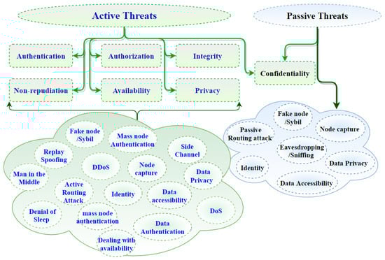 The security requirements of Table 2 are defined here. Authentication is confirming the identity of a claimer. Thus, in IoT, each device is expected to have the ability to verify the identity of its user and another device for the interaction with others. Authorization is giving access to an entity to interact in the IoT environment. Integrity refers to maintaining the consistency, precision, and dependability of information, while confidentiality is about making sure that sensitive information is accessed by authorized entities. Non-repudiation guarantees holding an entity accountable for its actions. Availability ensures that IoT services are there and can be accessed from anywhere and anytime the user needs them. Privacy is a property and/or process of ensuring that private information is only accessible by authorized entities. The properties above, taken as requirements, should be enforced to achieve the highest levels of safety. However, IoT device constraints will naturally limit the extent and depth achievable, which therefore necessitates a risk assessment to understand better the threats, impacts, and tradeoffs. Figure 2 shows how active and/or passive threats can impact those aforementioned properties within the IoT ecosystem [,,,].