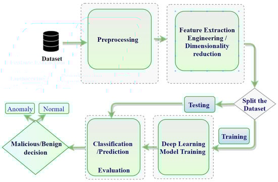 Traditional detection techniques, noted previously, have fallen short of detecting new complex attacks. As the volume of data increases, for example, into terabytes, it has become even more important to find alternative techniques. DL models can train using massive amounts of data to build robust anomaly detection systems. The model classifies the new traffic into either a normal or anomaly class []. DL techniques learn from hierarchical discriminative features discernable in the data. The fact that anomalous behavior is often not precisely defined poses challenges for conventional techniques; therefore, domain experts have begun to advocate solving the problem using DL techniques []. Some anomaly-based IDSs are used in the IoT context by employing deep learning techniques for their insights. The most common deep learning architectures employed for anomaly detection in conventional systems include CNN [,], DNN [], LSTM [,,], and RNN []. Such deep learning architectures are employed in an anomaly-detection system for either feature learning or classification []. Figure 4 shows the (typical) overall framework of IDS based on deep learning.