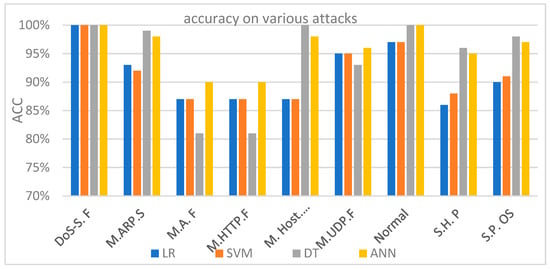 - An experimental study of the performance of four ML approaches, (a) LR, (b) SVM, (c) DT, and (d) ANN, is performed using the Bot-IoT [] and IoTID20 datasets [].