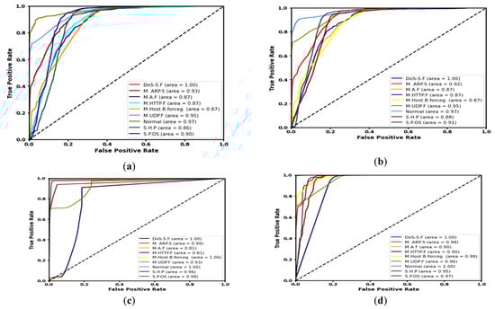 The accuracy (ACC) is the percentage of correctly identified cases divided by total cases that were considered (whole populations). Sensitivity is also known as “recall,” or true-positive rate (TPR) or simply the “detection rate.” Sensitivity intuitively indicates the model’s power to correctly identify attacks. Moreover, it provides the ability of the model classifier to find all the positive samples in the training model, while in the receiver operating characteristic curve, or ROC curve plots, FPR is represented on the X-axis, and TPR is represented on the Y-axis. In other words, the upper-left hand corner of the plot (image) is the “ideal” point, where TPR = 1 and the FPR = 0. Thus, using the ROC curve, efficiency of the model is measured as best when the Area Under the Curve (AUC) is maximized. Accordingly, ACC, ROC curve, and AUC (area under the ROC curve) are used to evaluate the model, whereas the ROC curve is a graph used to visualize the performance of classifiers at various threshold settings.