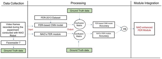 This dataset was employed to train and test the accuracy of the developed CNN-based FER model. Furthermore, we conducted an emotion recognition experiment with the NAO robot in a real-world context to test the NAO’s capacity to recognize facial expressions as well as the NAO’s FER module’s accuracy. The data collected during the experiment were also analyzed with the developed CNN-based FER model. To compute the accuracy of both models (the CNN-based FER module and the NAO’s FER module), the data recorded during the experimental sessions were also analyzed with the FER software, i.e., FaceReader 7 (developed by VicarVision and Noldus Information Technology, https://www.noldus.com/human-behavior-research/products/facereader accessed on 25 September 2021) already used in the literature [] and validated in various research studies []. Such software provided the ground truth data on FER and arousal detection. The CNN-based FER module outcome was also used to determine the arousal level of the interlocutor’s emotional expression. Finally, the developed model was integrated into the NAO platform under its Windows Python SDK and allowed to enhance the NAO robot’s awareness of human facial expression. The presented paper’s processing workflow is shown in Figure 1.