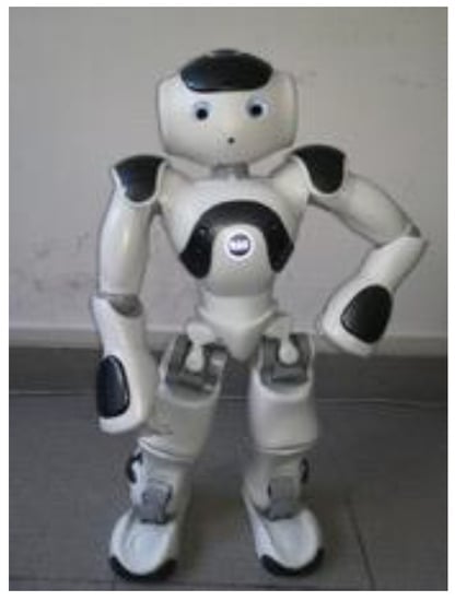 The experimental session was conducted using the humanoid robot NAO from SoftBank Robotics. NAO is 58 cm high and has a number of sensors and abilities such as those of moving, seeing, speaking, hearing, and limited manipulation of objects (Figure 2). The version of the robot used in this research was the latest NAO, v6. NAO has Python SDK (Naoqi) available to allow researchers to develop advanced intelligent components for robot motion processing, speech, and vision []. The robot is equipped with two built-in cameras, one located at the mouth level and the other located on its forehead. Both are 920p cameras able to run at 30 images/second for (up to) 1280 × 720 pixel images. NAO’s head can move 68 degrees vertically and 239 degrees horizontally, and its camera can see 61° horizontally and 47° vertically. Hence, it has good vision of its environment. Its forehead camera was used to record videos of the person in front of NAO during the experimental session. The robot platform also provides vision APIs (application programming interfaces) for image processing, movement detection, background darkness checking, and estimating the emotions of the human in front of the robot (described in Section 2.3).