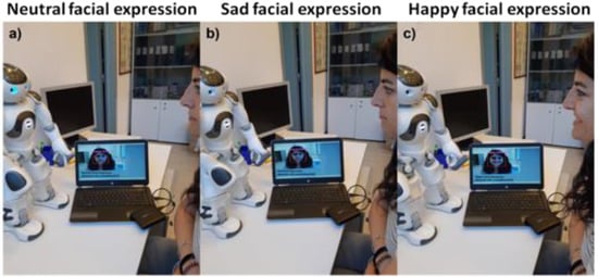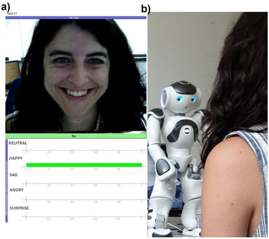 Artificially intelligent agents such as social robots (SRs) have increased in popularity over the last few decades and are expected to be used in a variety of social applications. SRs can currently execute a variety of tasks autonomously, which has resulted in their continuous introduction into society. SR applications that are becoming available include therapy for autistic children [], exercise coaches [], specialized education [], and assistance to elderly persons affected by dementia []. Moreover, studies have shown that a robot can affect its social environment beyond the person who is interacting with it [,]. For example, studies of robots used in autism therapy have demonstrated that robots can influence the way children interact with others [], just as many previous works have shown that employing robots in the rehabilitation field has considerable effects on patient improvement []. In all these applications, robots are usually designed to interact with humans in a spontaneous, interpersonal way, often with specific social–emotional goals []. However, these agents are still struggling to interact with users in a human-like way, which is an issue that has proved to be challenging to overcome. Just as human–human interaction can be discouraged by the absence of initiative from one of the parties, human–robot interaction can fall short if there is limited or no commitment by the robot or the human user. At the same time, to take initiative, the robot must be able to choose what actions to perform and to what extent. Additionally, it should adapt its behaviors based on the user’s reactions and possibly produce empathetic responses to the emotions of the person it is interacting with. Indeed, empathy is a crucial component of human–human communication, so replicating it for SRs is important. As a result, the first step towards achieving human-like interaction skills is for the robot to adequately recognize the user’s emotional state and accordingly adjust its responses, thus mimicking human empathetic behaviors [].