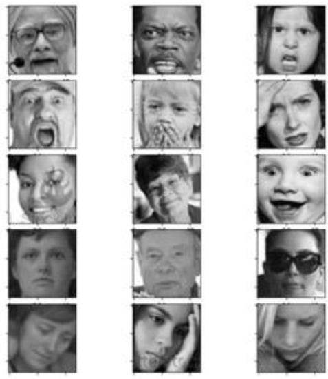The CNN-based FER model was trained and tested on the FER2013 dataset (Figure 4). The images employed in this analysis were related to the following expressions: angry, scared, happy, neutral, sad, and surprised. Before applying the CNN algorithm, a pre-processing step was conducted on the input images; to ensure facial geometric correspondence and keep face size constant across the dataset images, affine transformation (rotation, scaling, and translation) was performed on the input images. Affine transformation is usually used to normalize face geometric position and maintain face magnification invariance []. The preprocessed images were then used to feed the CNN. The CNN structure employed in this work was heuristically chosen in a similar fashion to previously reported CNN structures in FER analysis [].
