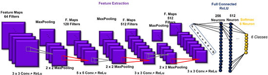 The CNN architecture consisted of 4 convolutional layers, 4 pooling layers, and two layers fully connected prior to the output layer. The first convolutional layer was composed of 64 filters (size: 3 × 3) applied to the input images to generate 64 feature maps of the images. The second, third, and fourth convolutional layers were composed of 128 (size: 5 × 5), 512 (size: 3 × 3), and 512 (size: 3 × 3) filters, respectively. After each convolutional layer, batch normalization was introduced. The activation function employed in all 4 convolutional layers and both fully connected layers was the rectified linear unit (ReLU) function, which we used to add non-linearity to the network []. Then, as a down-sampling or pooling layer, MaxPooling was selected, with the largest element from the rectified feature map retained. A filter size of 2 × 2 was implemented for all the MaxPooling layers. The two fully connected layers consisted of 256 and 512 neurons. The fully connected layers were employed to summarize information and compute the class score. Lastly, a SoftMax function was used in the output layer to output a probability value from 0 to 1 for each of the six classification classes (angry, scared, happy, neutral, sad, and surprised). All the biases of the CNN were initialized to a small constant, i.e., 0.1, whereas the weights were initialized in a pseudo-random manner by employing a truncated normal distribution (standard deviation = 0.1). Finally, the implemented loss function was categorical cross-entropy. The CNN architecture is shown in Figure 5.