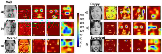 Convolutional neural network (CNN) heatmaps. Representative input image of the FER2013 dataset along with the related heatmap resulting from each of the four convolutional layers for images labeled (a) sad, (b) angry, (c) scared, (d) happy, (e) neutral, and (f) surprised.