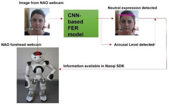 Information-processing workflow. The images were retrieved from NAO’s forehead webcam and analyzed through the CNN-based FER model. The model outcome, integrated into Naoqi SDK, was available for the robot to use.
