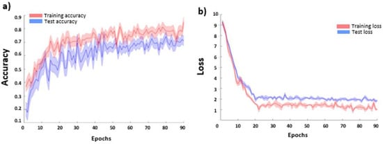 The optimization procedure was iterated for 90 epochs, with a batch size of 128 samples. The metric used for evaluating the model was accuracy. Accuracy represents the percentage of correct predictions out of the total number of test samples. Such metrics were evaluated by counting the number of correct CNN predictors after an argmax evaluation of the CNN output vector and averaging them among the plateau iterations. The described CNN model was implemented in Python using the Keras API with the TensorFlow backend. For model evaluation, the scikit learn library was utilized.