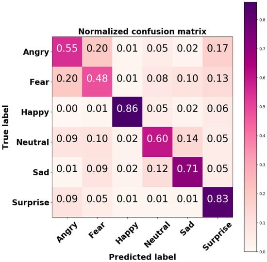 Normalized confusion matrix of the CNN-based FER model tested on the FER2013 dataset.