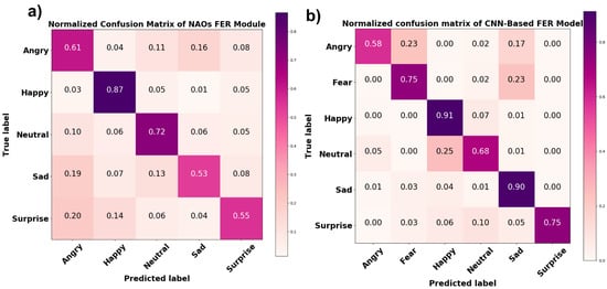 Normalized confusion matrix of (a) NAO’s FER module and (b) the CNN-based FER model tested on experimental data.