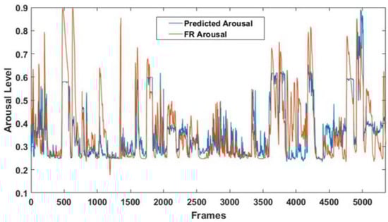 A significant correlation between the arousal detected by the FaceReader 7 software and the predicted arousal was obtained (r = 0.69; p = ~0), thus demonstrating the good performance of the multivariate analysis []. Figure 11 shows the arousal levels detected throughout the entire experimental session by the GLM model and the FaceReader 7 software.