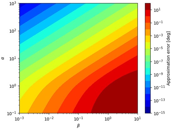 The approximation error is a function of the relative position in 3D space. In order to visualize the error tendency with respect to the relative position, the parameters and are defined and can be substituted into Equation (17) as