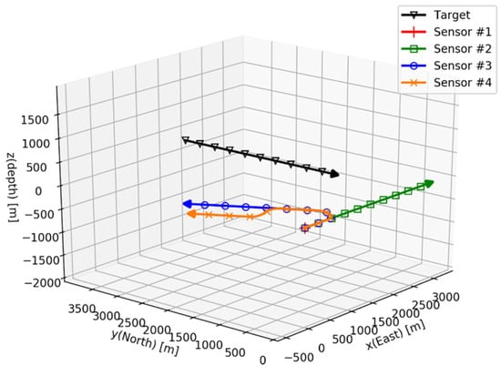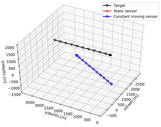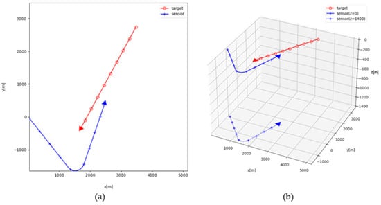 In the simulation scenario, the target and the sensor exist in 3D space, and their trajectories as seen from the horizontal plane are shown in Figure 3a. The initial distance of the target from the sensor on the horizontal plane is 4 km. The target is subjected to the constant velocity motion without the depth changing.
