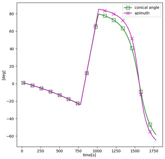 The differences between the conic angle and the azimuth histories in m are shown in Figure 4. The target is located in the head/tail direction of the sensor at the beginning and end of the second leg, respectively, so the difference between the conic angle and the azimuth is conspicuous in the second leg.
