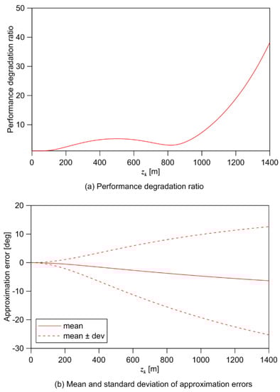 The tendency of is depicted in Figure 5a. For the interval, increases up to 5.2 in proportion to . In , decreases as increases. Although, they are not included in , errors are still increasing in the bearing and course for this interval. As the influence of the approximation error increases, increases exponentially from .