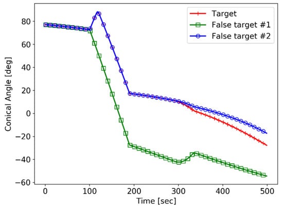 After 100 s, when the change in the yaw angle begins, False Target #1 is separated from the target. This change is the first maneuver on the plane, but False Target #2, which is symmetrical with the target in the plane, still has the same conic angle trajectory as the target.