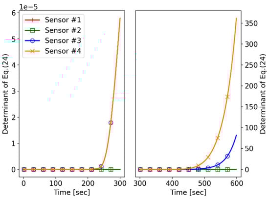 In the left subplot, the performance index values of “Sensor #3” and “Sensor #4” are nonzero after their maneuvers. At this point, the values are not large yet, but they increase over time. On the other hand, the performance index values of “Sensor #1” and “Sensor #2” are equal to 0. This is because “Sensor #1” and the “Sensor #2” move with a constant velocity (CV) model, and their relative target state vector is also changed in the CV model, which cannot satisfy the observability condition of Equation (26). This shows that the sensor maneuver is required to achieve the observability of the CoTMA system.