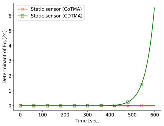 For each sensor, the performance index of the CoTMA system and that of the CDTMA system are compared. Figure 13 shows performance index tendency for the “static sensor”. As mentioned in Simulation I, the sensor scenario cannot establish the observability in the CoTMA system. However, in the CDTMA system, the performance index value of the trajectory is nonzero, indicating that it satisfies the observability conditions of the CDTMA system.